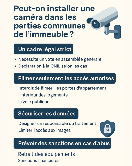Les zones autorisées sont limitées à la sécurisation des accès (hall d’entrée, interphone, local vélo, caves), et à condition que l’angle de vue soit justifié et limité.