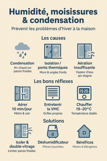 La rénovation énergétique (isolation des murs, double vitrage) reste la solution durable pour limiter la condensation.