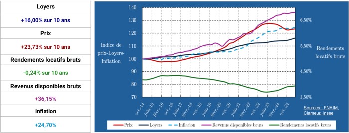 - Les rendements locatifs bruts ont diminué depuis 10 ans, mais réaugmentent un peu depuis 2 ans.